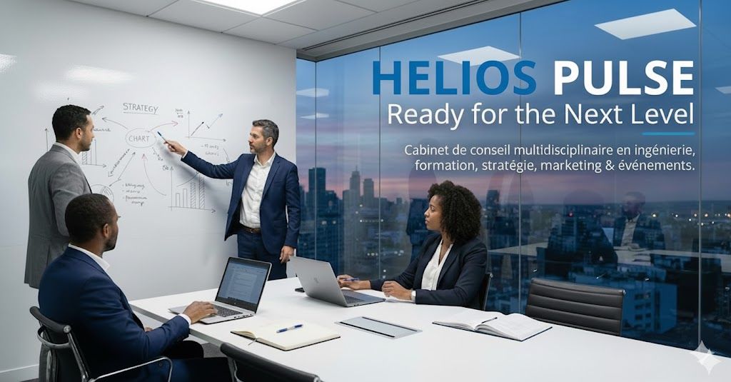 🌍 HELIOS PULSE Ready for the Next Level HELIOS PULSE est un cabinet de conseil multidisciplinaire spécialisé en ingénierie, formation, conseil stratégique, marketing et communication événementielle. Nous accompagnons les entreprises, institutions et organisations dans la structuration, la planification et la mise en œuvre de projets à fort impact, durables et orientés résultats.